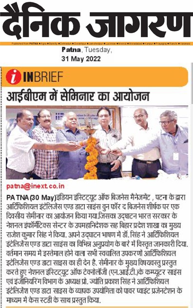 इंडियन इंस्टिट्यूट ऑफ बिजनेस मैनेजमेंट, पटना के द्वारा आर्टिफिशियल इंटेलिजेंस एण्ड डाटा साइंस वुन फॉर द बिजनेस शीर्षक पर एक दिवसीय सेमीनार का आयोजन किया गया. जिसका उद्घाटन भारत सरकार के नेशनल इंफॉर्मेटिक्स सेन्टर के उपमहानिदेशक सह बिहार प्रदेश शाखा का मुख्य राजेश कुमार सिंह ने किया. अपने उद्घाटन भाषण में डॉ. सिंह ने आर्टिफिशियल इंटेलिजेंस एण्ड डाटा साइंस का विभिन्न अनुप्रयोग के बारे में विस्तृत जानकारी दिया. वर्तमान समय में इस्तेमाल होने वाला सभी स्वचालित उपकरणों आर्टिफिशियल इटेलिजेंस एण्ड डाटा साइस का ही देन है. सेमीनार के मुख्य विषयवस्तु प्रस्तुत करते हुए नेशनल इंस्टिट्यूट ऑफ टेक्नोलॉजी (एन.आई.टी.) के कम्प्यूटर साइंस एवं इंजीनियरिंग विभाग के अध्यक्ष प्रो. ज्योति प्रकाश सिंह ने आर्टिफिशियल इंटेलिजेश एण्ड डाटा साइस के व्यापक उपयोगिता को पावर प्वाइंट प्रजेनटेशन के माध्यम में केस स्टडी के साथ प्रस्तुत किया.