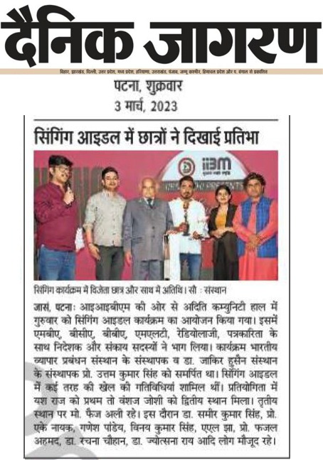 आइआइबीएम की ओर से अदिति कम्युनिटी हाल में गुरुवार को सिंगिंग आइडल कार्यक्रम का आयोजन किया गया। इसमें एमबीए, बीसीए, बीबीए, एमएलटी, रेडियोलाजी, पत्रकारिता के साथ निदेशक और संकाय सदस्यों ने भाग लिया। कार्यक्रम भारतीय व्यापार प्रबंधन संस्थान के संस्थापक व डा. जाकिर हुसैन संस्थान के संस्थापक प्रो. उत्तम कुमार सिंह को समर्पित था। सिंगिंग आइडल में कई तरह की खेल की गतिविधियां शामिल थीं। प्रतियोगिता में यश राज को प्रथम तो वंशज जोशी को द्वितीय स्थान मिला। तृतीय स्थान पर मो. फैज अली रहे। इस दौरान डा. समीर कुमार सिंह, प्रो. एके नायक, गणेश पांडेय, विनय कुमार सिंह, एएल झा, प्रो. फजल अहमद, डा. रचना चौहान, डा. ज्योत्सना राय आदि लोग मौजूद रहे।
