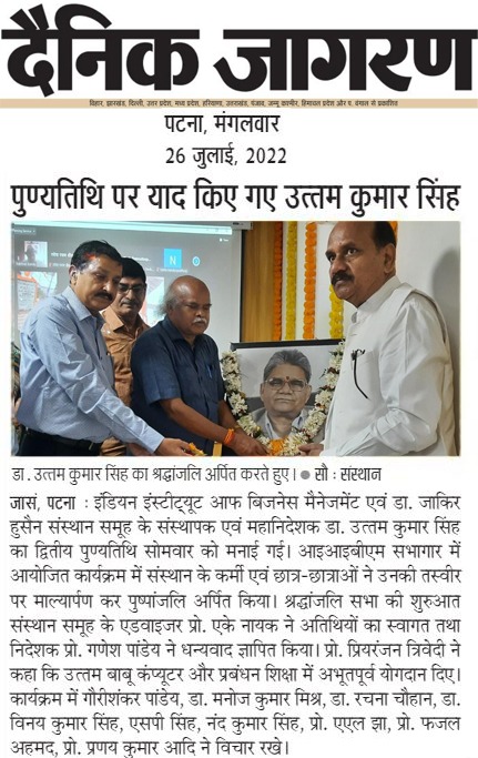 इंडियन इंस्टीट्यूट आफ बिजनेस मैनेजमेंट एवं डा. जाकिर हुसैन संस्थान समूह के संस्थापक एवं महानिदेशक डा. उत्तम कुमार सिंह 'के का द्वितीय पुण्यतिथि सोमवार को मनाई गई । आइआइबीएम सभागार में आयोजित कार्यक्रम में संस्थान के कर्मी एवं छात्र-छात्राओं ने उनकी तस्वीर पर माल्यार्पण कर पुष्पांजलि अर्पित किया। श्रद्धांजलि सभा की शुरुआत संस्थान समूह के एडवाइजर प्रो. एके नायक ने अतिथियों का स्वागत तथा निदेशक प्रो. गणेश पांडेय ने धन्यवाद ज्ञापित किया। प्रो. प्रियरंजन त्रिवेदी ने कहा कि उत्तम बाबू कंप्यूटर और प्रबंधन शिक्षा में अभूतपूर्व योगदान दिए । कार्यक्रम में गौरीशंकर पांडेय, डा. मनोज कुमार मिश्र, डा. रचना चौहान, डा. विनय कुमार सिंह, एसपी सिंह, नंद कुमार सिंह, प्रो. एएल झा, प्रो. फजल अहमद, प्रो. प्रणय कुमार आदि ने विचार रखे।