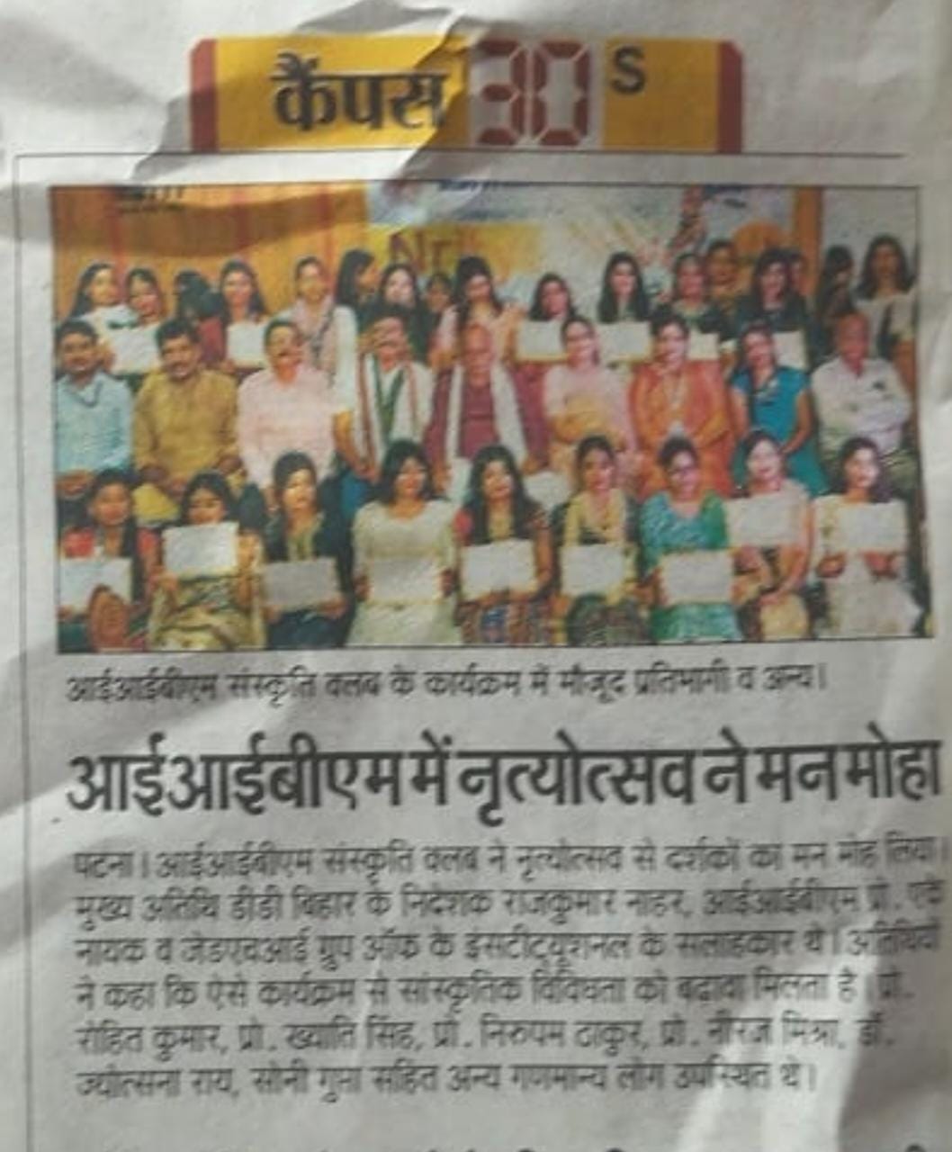 आईआईबीएम संस्कृति क्लब ने नृत्योत्सव से दर्शकों का मन मोह लिया। मुख्य अतिथि डीडी बिहार के निदेशक राजकुमार नाहर, आईआईबीएम प्रो. ए नायक व जेडरवआई ग्रुप ऑफ के इंस्टीट्यूशनल के सलाहकार थे। अतिथियों ने कहा कि ऐसे कार्यक्रम से सांस्कृतिक विविधता को बढ़ावा मिलता है। प्रो... रोहित कुमार, प्रो. ख्याति सिंह, प्रो. निरुपम ठाकुर, प्रो. नीरज मिश्रा. डॉ. ज्योत्सना राय, सोनी गुप्ता सहित अन्य गणमान्य लोग उपस्थित थे।