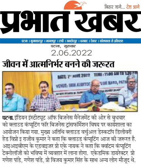 इंडियन इंस्टीट्यूट ऑफ बिजनेस मैनेजमेंट की ओर से बुधवार को क्लाउड कंप्यूटिंग फॉर बिजनेस ट्रांसफॉर्मेशन विषय पर कार्यशाला का आयोजन किया गया. मुख्य अतिथि क्लाउड वर्चुअल डेस्कटॉप डिलीवरी हेड विप्रो इ राजीव कुमार ने कहा कि क्लाउड कंप्यूटिंग आज की जरूरत है. आइआइबीएम के एडवाइजर प्रो एके नायक ने कहा कि क्वांटम कंप्यूटिंग टेक्नोलॉजी को भविष्य में व्यवहार में लाना होगा. एकेडमिक डायरेक्टर प्रो गणेश पांडे, गणेश पांडे, प्रो विजय कुमार सिंह के साथ अन्य लोग मौजूद थे.