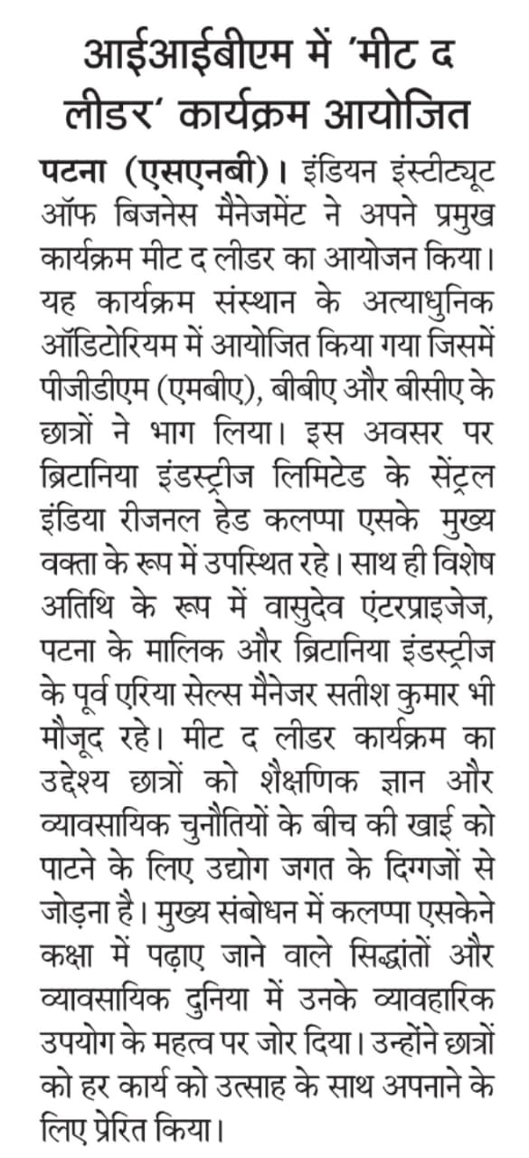 लीडर' कार्यक्रम आयोजित पटना (एसएनबी)। इंडियन इंस्टीट्यूट ऑफ बिजनेस मैनेजमेंट ने अपने प्रमुख कार्यक्रम मीट द लीडर का आयोजन किया। यह कार्यक्रम संस्थान के अत्याधुनिक ऑडिटोरियम में आयोजित किया गया जिसमें पीजीडीएम (एमबीए), बीबीए और बीसीए के छात्रों ने भाग लिया। इस अवसर पर ब्रिटानिया इंडस्ट्रीज लिमिटेड के सेंट्रल इंडिया रीजनल हेड कलप्पा एसके मुख्य वक्ता के रूप में उपस्थित रहे। साथ ही विशेष अतिथि के रूप में वासुदेव एंटरप्राइजेज, पटना के मालिक और ब्रिटानिया इंडस्ट्रीज के पूर्व एरिया सेल्स मैनेजर सतीश कुमार मौजूद रहे। मीट द लीडर कार्यक्रम का उद्देश्य छात्रों को शैक्षणिक ज्ञान और व्यावसायिक चुनौतियों के बीच की खाई को पाटने के लिए उद्योग जगत के दिग्गजों से जोड़ना है। मुख्य संबोधन में कलप्पा एसकेने कक्षा में पढ़ाए जाने वाले सिद्धांतों और व्यावसायिक दुनिया में उनके व्यावहारिक उपयोग के महत्व पर जोर दिया। उन्होंने छात्रों को हर कार्य को उत्साह के साथ अपनाने के लिए प्रेरित किया ।