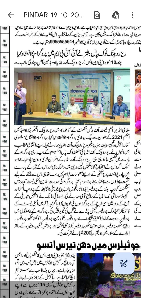 ے ایک بیداری پروگرام کا انعقاد کیا گیا۔ پروگرام کا افتتاح شری یکشن کمار راجیش رنجن ، چیف جنرل مینیجر، ریزرو بینک آف انڈیا، بہار نے کیا۔ اپنے افتتاحی خطاب ں ہلکی میں انہوں نے ریزرو بینک آف انڈیا کی متعلقہ لوک پال اسکیم کے بیداری پروگرام کے ے بارے میں تفصیلی جانکاری دی ۔ ریزرو بینک آف انڈیا کے افسران شری و رون اپادھیائے اور ونے کنک اگر وال نے اجتماع کو ڈیجیٹل لین دین میں دھوکہ دہی اور اس کے حل کے بارے ینی میں پاور پوائنٹ پریزنٹیشن کے ذریعے معلومات فراہم کیں۔ ساتھ ہی اس سے بچنے کے لیے مختلف پہلوؤں سے چوکنا رہنے پر زور دیا گیا۔ پروگرام کی صدارت انڈین انسٹی ٹیوٹ آف بزنس مینجمنٹ گروپ، پٹنہ کے پروفیسر ایڈوائز رہ گلوبل او بین یو نیورسٹی ناگالینڈ کے پرو چانسلر اور کمپیوٹر سوسائٹی آف انڈیا کے سابق قومی صدر نے کی۔ اوہ ! کی نائک نے ڈیجیٹل تبدیلی کے کے آج کے دور میں اسی طرح کے پروگراموں کی خوبیوں کو اجا گر کیا۔ آخر میں انسٹی ٹیوٹ کے کی ڈائریکٹر اکیڈمک پروفیسر کینیش پانڈے نے شکریہ کی تجویز پیش کی ۔ پروگرام کے اہم لوگوں میں سار پروفیسر ۔ روہت کمار، ڈاکٹر جیوتشا رائے، پروفیسر بیخو نارمن، پروفیسر ۔ کانکشا سنگھ، پروفیسر۔ ریتیکا سنگھ ، پروفیسر ۔ مدن موہن سنگھ ، پروفیسر کو شامبی کوشل اور پروفشر - شکیب وغیرہ کے ساتھ