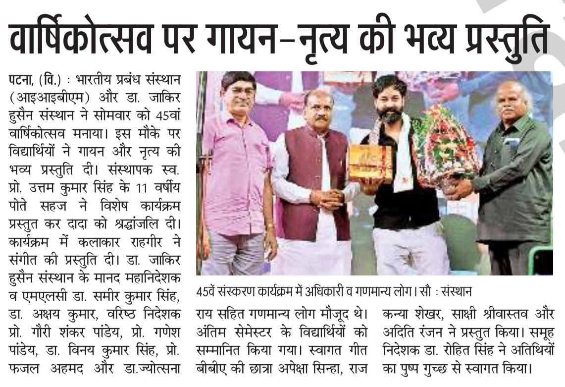 भारतीय प्रबंध संस्थान (आइआइबीएम) और डा. जाकिर हुसैन संस्थान ने सोमवार को 45वां वार्षिकोत्सव मनाया। इस मौके पर विद्यार्थियों ने गायन और नृत्य की भव्य प्रस्तुति दी। संस्थापक स्व. प्रो. उत्तम कुमार सिंह के 11 वर्षीय पोते सहज ने विशेष कार्यक्रम प्रस्तुत कर दादा को श्रद्धांजलि दी। कार्यक्रम में कलाकार राहगीर ने संगीत की प्रस्तुति दी। डा. जाकिर हुसैन संस्थान के मानद महानिदेशक व एमएलसी डा. समीर कुमार सिंह, डा. अक्षय कुमार, वरिष्ठ निदेशक प्रो. गौरी शंकर पांडेय, प्रो. गणेश पांडेय, डा. विनय कुमार सिंह, प्रो. फजल अहमद और डा. ज्योत्सना