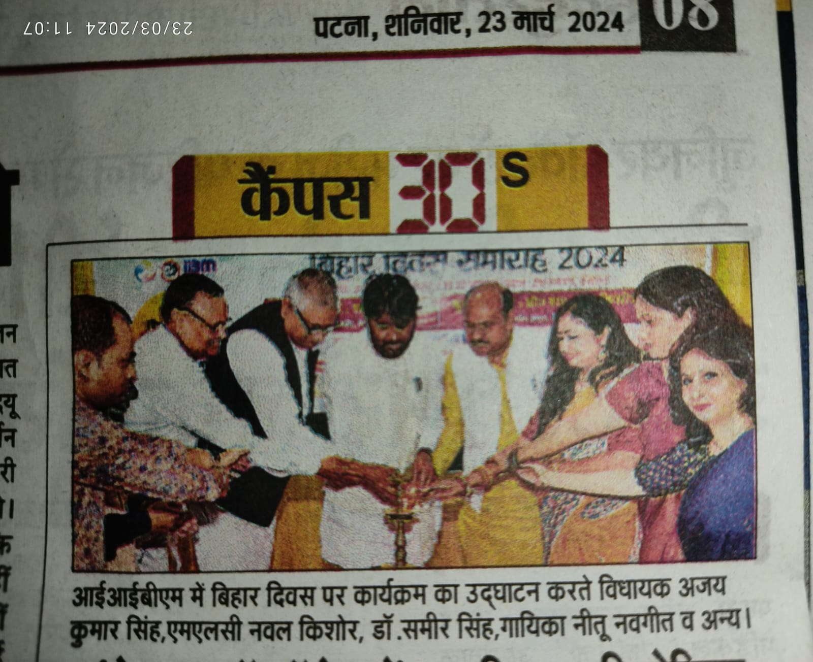 आईआईबीएम में बिहार दिवस पर कार्यक्रम का उद्घाटन करते विधायक अजय कुमार सिंह, एमएलसी नवल किशोर, डॉ. समीर सिंह, गायिका नीतू नवगीत व अन्य ।